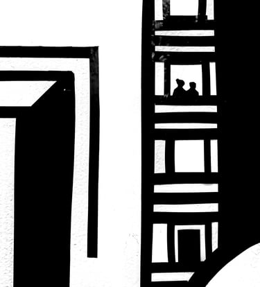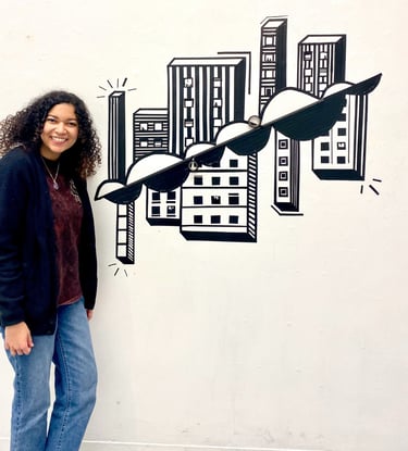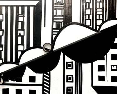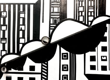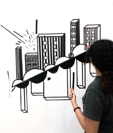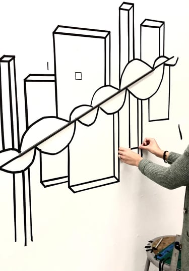 This piece was a play on positive and negative space within the different organic shapes provided within the world, using black vinyl tape and a metal rod. I was inspired by the unique and urban buildings displayed in the beautiful city of Denver. Using the wall as the negative space and the black vinyl tape as the positive aspects, I created buildings that used shape, form, and pattern to suggest dimension and plane. I wanted to create a type of illusion that allowed the negative space to push back and positive space to protrude, creating dimensionality. The metal rod itself is embedded diagonally in the middle, to separate the alternating buildings.